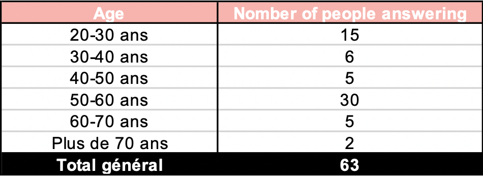 Le sondage a été diffusé en France sur des forums de discussion de voyages afin de toucher un large éventail de participants. Au total 63 répondants ont participé au sondage, offrant ainsi un échantillon diversifié en termes d’âge, de genre, et de fréquence de voyage. Cette diversité a permis de mieux comprendre les différents segments de marché et de leurs comportements spécifiques.