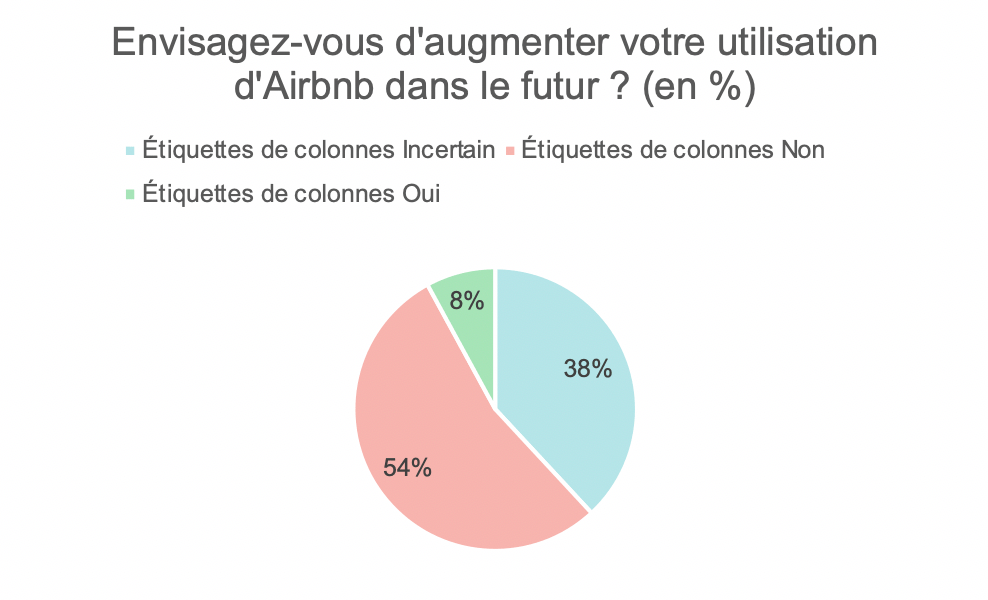 Le graphique ci-dessus montre les intentions des répondants concernant l’augmentation de leur utilisation d’Airbnb dans le futur. La majorité des répondants, soit 54%, n’envisage pas d’augmenter leur utilisation d’Airbnb. Cela suggère que plus de la moitié des participants sont satisfaits de leur utilisation actuelle ou préfèrent d’autres modes d’hébergement. Il existe un segment non négligeable (38%) d’indécis. Cela représente une opportunité pour Airbnb de convaincre ces utilisateurs à travers des améliorations de services, des offres attractives, ou des stratégies marketing ciblées. Le faible pourcentage de ceux qui prévoient d’augmenter leur utilisation (8%) peut indiquer des réserves spécifiques ou des préférences établies pour d’autres formes d’hébergement.